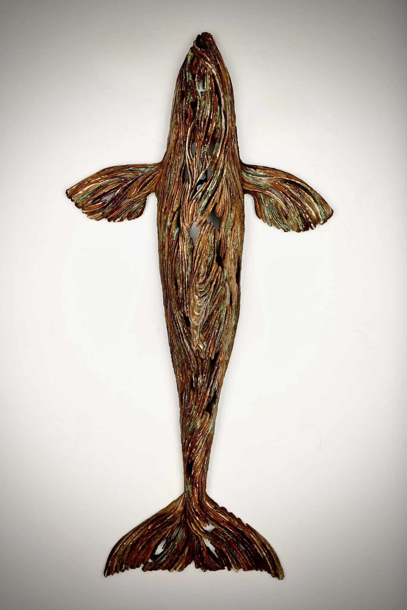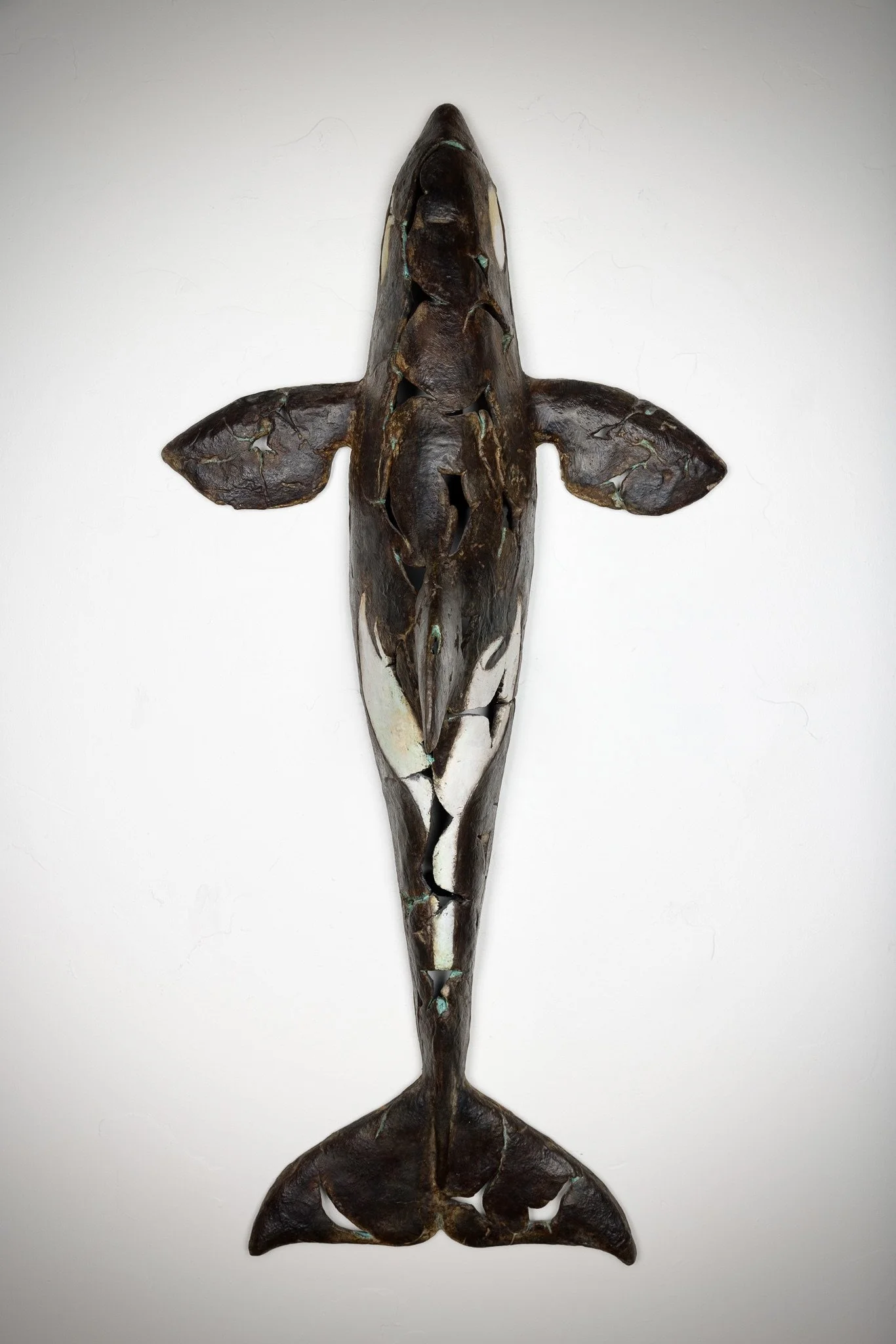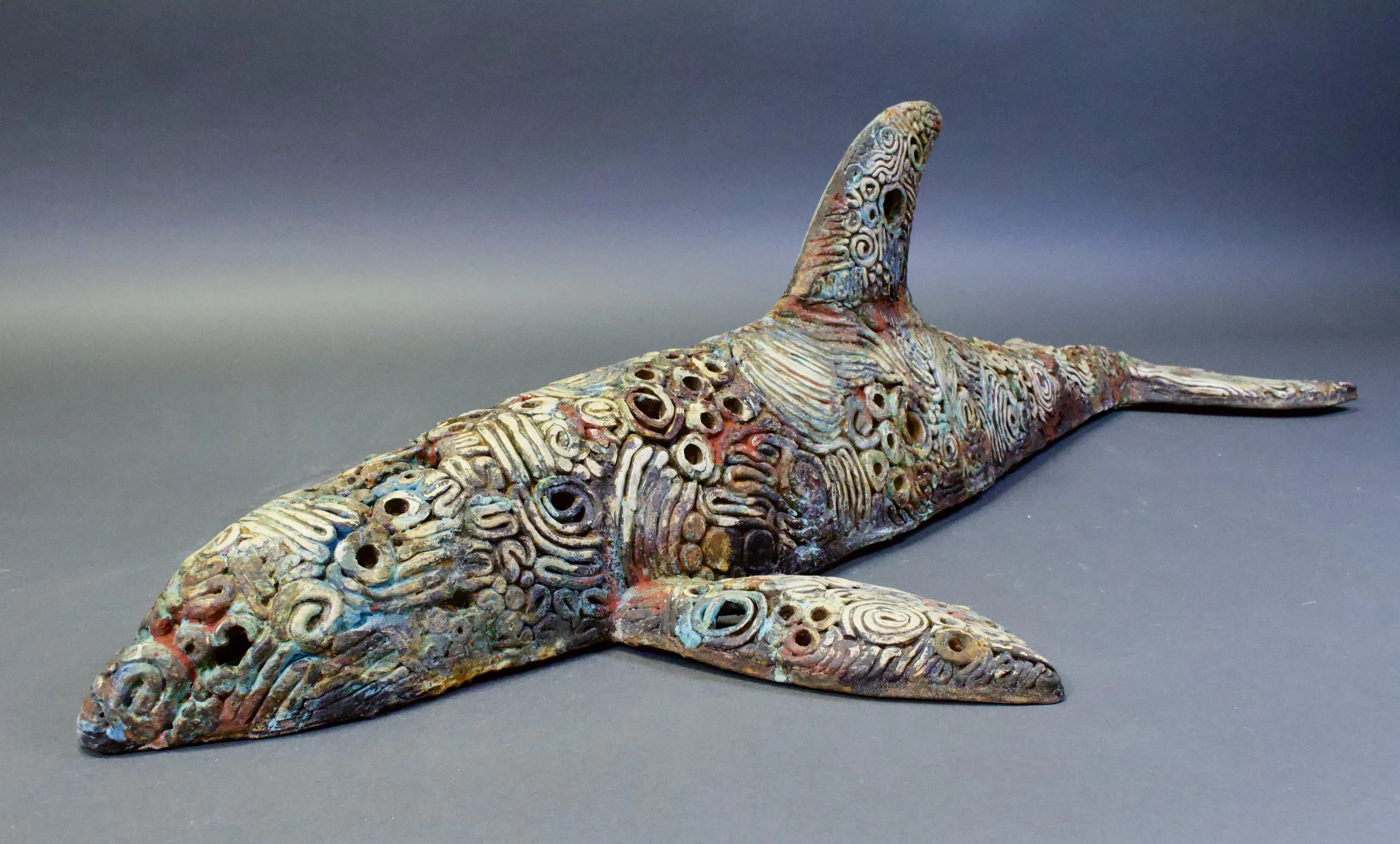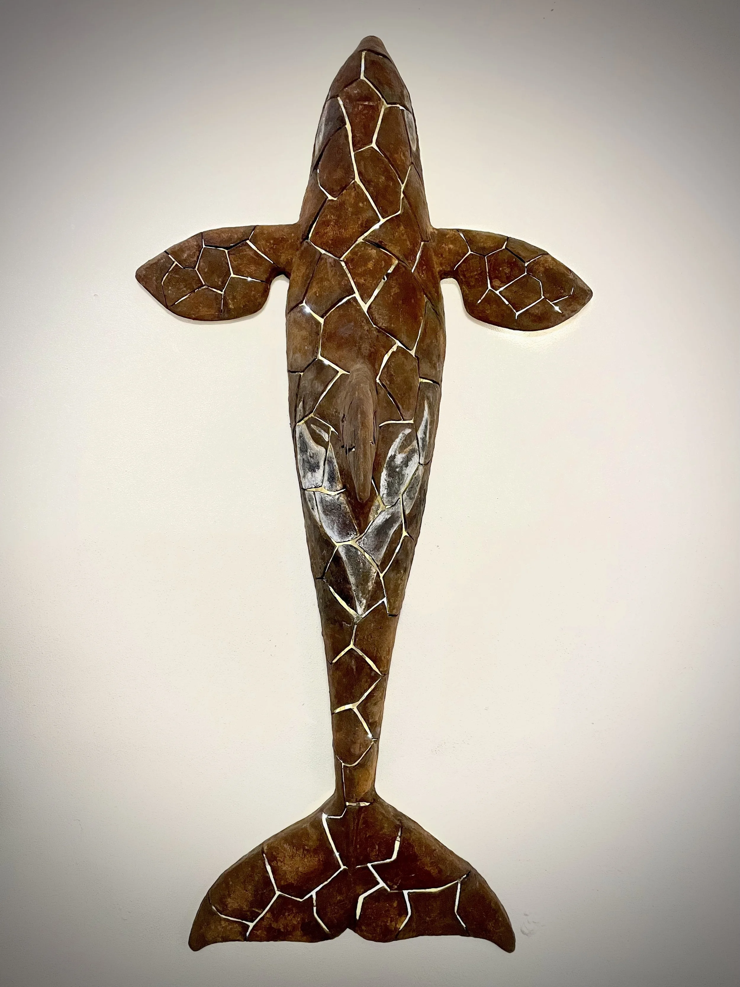 a family trip through the San Juan Islands brought me face-to-face with the magic of wild Orca pods. Witnessing both Transients hunting and Residents navigating their world—even swimming while half-asleep—was profoundly moving. I was compelled to study their form and begin an Orca Whale. But in researching, I encountered a captivating bird’s-eye view photo that changed my artistic direction. The aerial perspective highlighted the stark reality of their struggle—starvation caused by pollution, dams, and overfishing. My art shifted from creating a single sculpture to producing a series with textural, fading variations. Each sculpted form became a mantra, using textural and design variations to symbolize the "disappearance and dissolution" of the species.