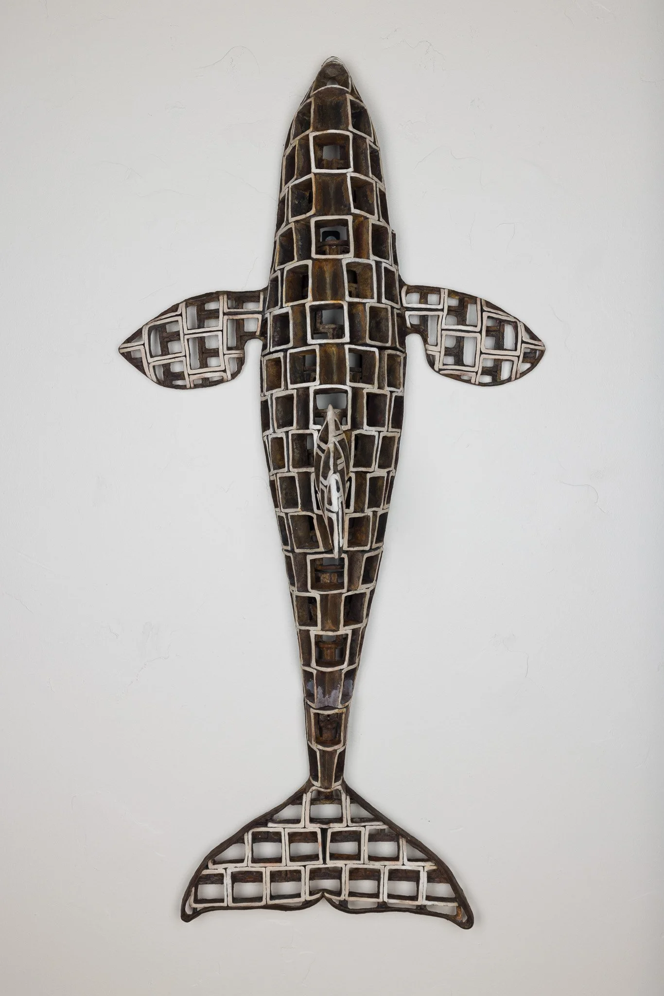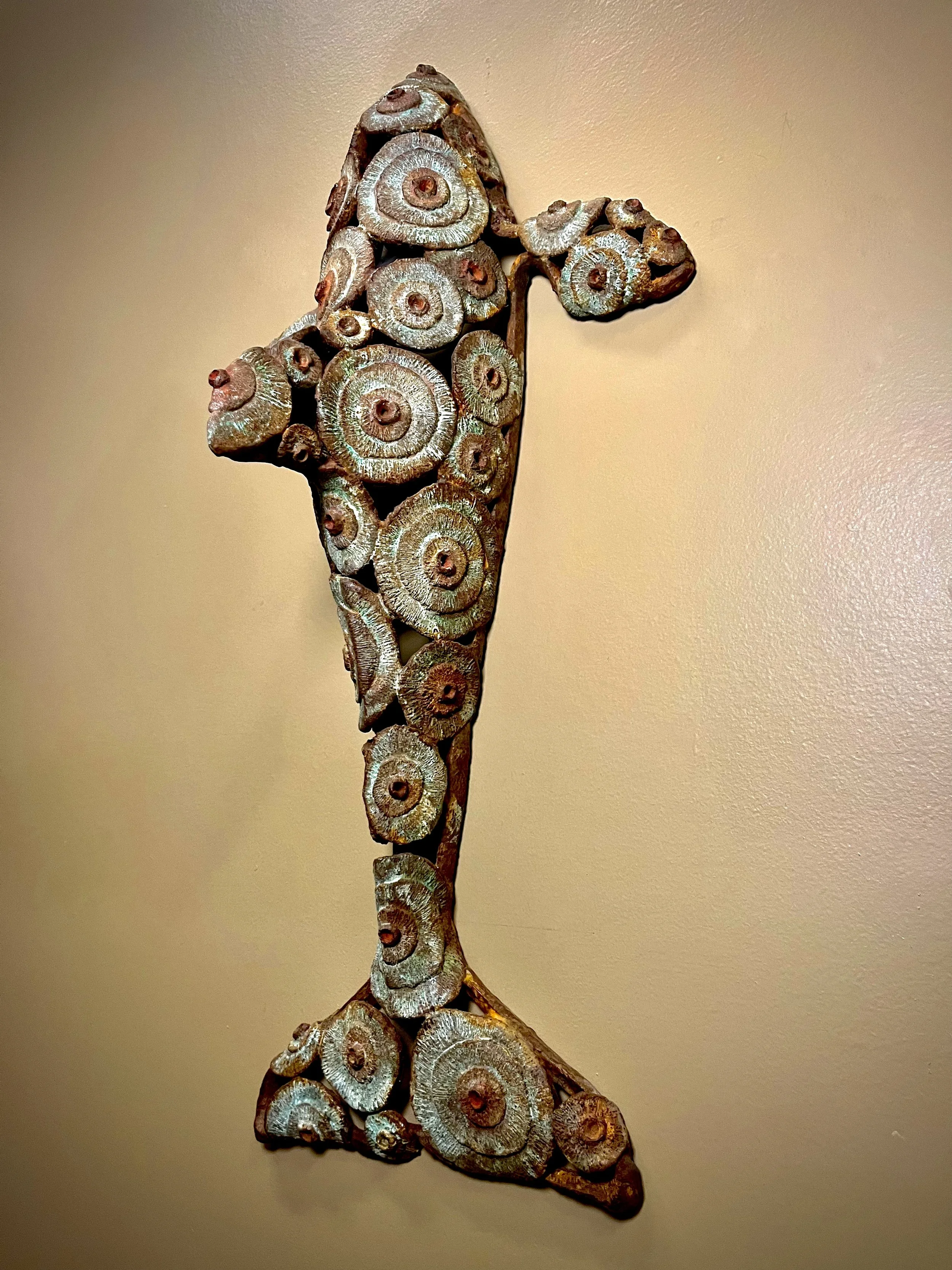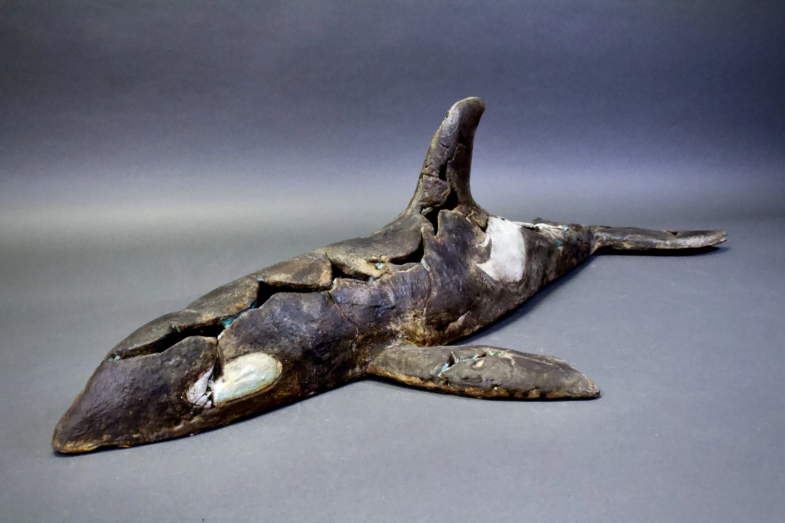 a family trip through the San Juan Islands brought me face-to-face with the magic of wild Orca pods. Witnessing both Transients hunting and Residents navigating their world—even swimming while half-asleep—was profoundly moving. I was compelled to study their form and begin an Orca Whale. But in researching, I encountered a captivating bird’s-eye view photo that changed my artistic direction. The aerial perspective highlighted the stark reality of their struggle—starvation caused by pollution, dams, and overfishing. My art shifted from creating a single sculpture to producing a series with textural, fading variations. Each sculpted form became a mantra, using textural and design variations to symbolize the "disappearance and dissolution" of the species.